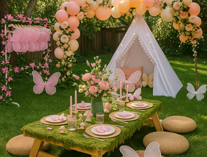 Think moss-kissed tables, fluttering butterflies, twinkling lights, and pretty pastels — a dreamy picnic that feels lifted from an enchanted forest.
